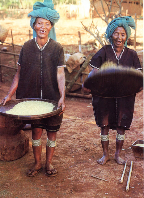 The Rawang speak a Sino - Tibetan Language of the Nungish branch, and are related rather to the Derung and Nu peoples who live across the border in Yunnan rather than to their neighbors in Burma. On the map above, they are shown in somewhat brighter green, and are found to the northeast of the Jingpo. I have written more about the Rawang here. https://folkcostume.blogspot.com/2019/09/overview-of-costumes-of-lesser-known.html