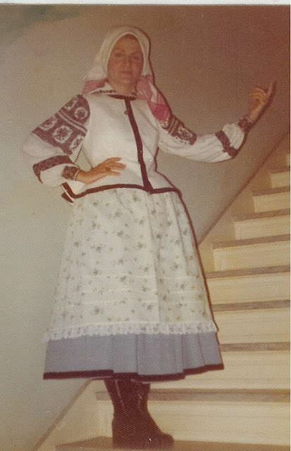 The outfit consists of a chemise with local embroidery on inset [ustawka], cuffs and collar, skirt, in this case of store bought cloth. apron of two loom widths of linen, embroidered on the bottom edge, with an ornamental joining in the middle. Kamizelka in cloth matching the skirt of standard Halychyna cut, fastening in front, ribbons around the bottom edge. Kybalka on the head [wooden ring covered with cloth], covered by a kerchief, and boots. Here is another photo of a somewhat older form of the costume; this one is from the village of Litynia.