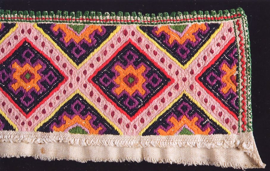 Thank you Roman, what beautiful embroidery! I am puzzled as to why so little thread shows on the wrong side of the embroideries - such dense stitching on the right side and very little on the back, where are the verticals on the reverse of the cross stitching for example? And where the collar in progress is shown, you can see on the front side that a thread in the centre of each design line has been picked up to make a double line, yet even in the deep purple it doesn't really show on the reverse. Perhaps the linen is very thick and the short non-diagonal stitches sink into the spaces between the fabric threads?