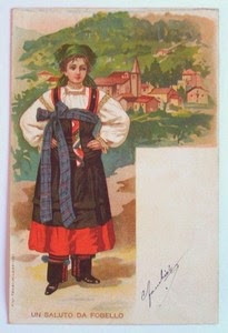 A bodice with an attached skirt is worn over the chemise. They are black, and there is a panel of red cloth attached to the hem, which varies in width from village to village. Here is E. Calderini's image of the Fobello costume. The hem length varies according to time period and taste.