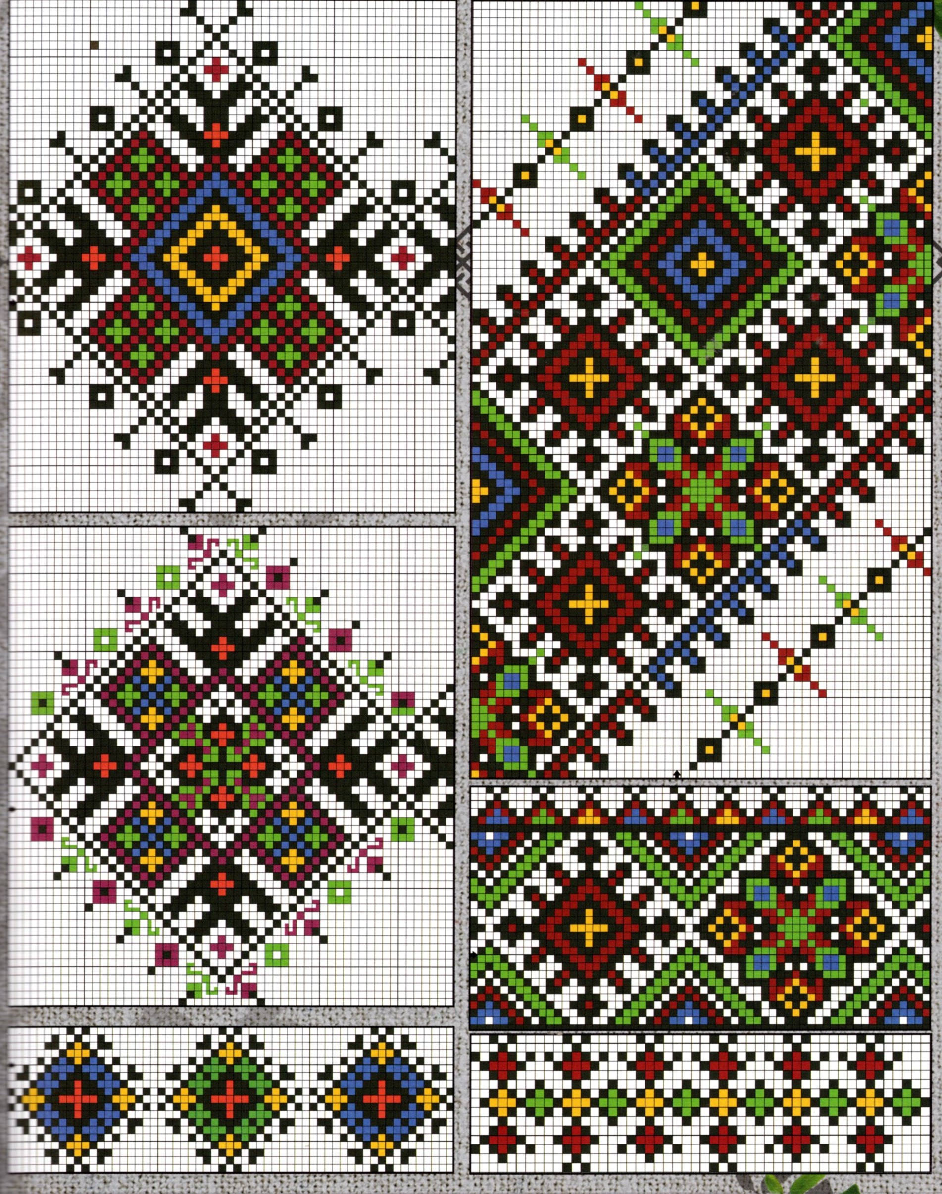 Often inspiration was taken from Hutsul nyzynka designs, and they were altered to be done in cross stitch. They often developed further, and so were born designs that could not possibly be done in nyzynka. A couple examples from my personal collection.