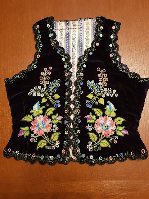 Two types of vest were worn with this outfit, the first was the gorset, a waist length vest that was laced or hooked closed in front, with lappets. It was extremely popular in Poland at the time, and was often highly ornamented, usually with beads, bugles, sequins, and such. This is visible in some of the images above, and this one, from the village of Brodky near Mikolaiv.