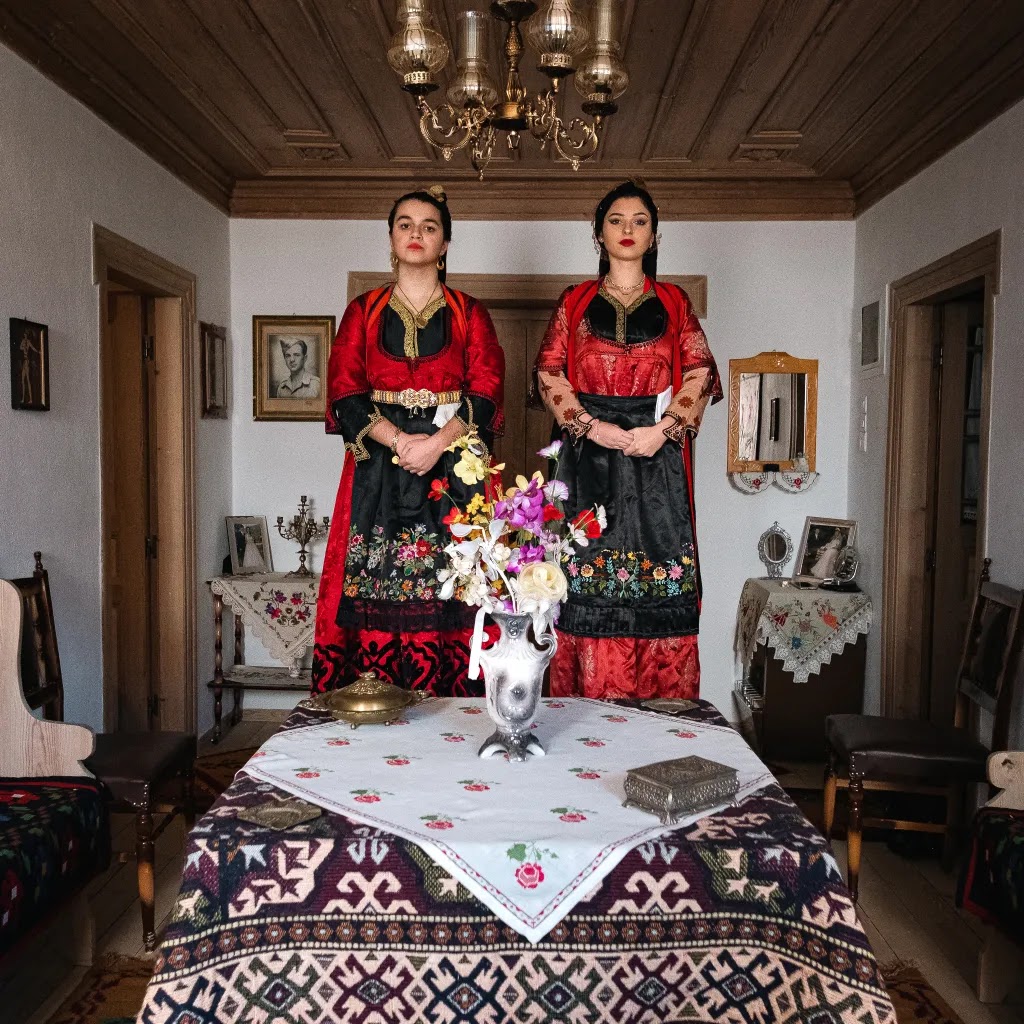 The traditional outfit of Metsovo women comes in two forms, the regular daily outfit and the dress outfit. The dress outfit is made and embroidered by professional tailors, but the pieces of the daily outfit are made at home. Here is a photo of a group of people in the daily costume.