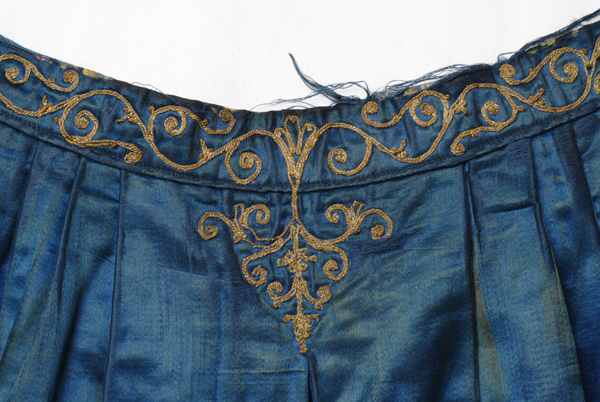 Alternatively, a dress apron may be purchased from the professional tailors. These are also of fine cloth, in various colors, have a rounded bottom edge to which is sewn a pleated flounce, and are embellished with cord applique or floral embroidery.