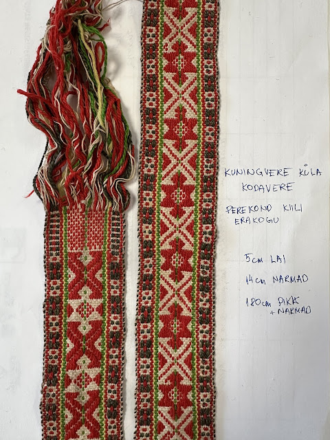 A wrap skirt, seelik, was held in place with a sash, vöö. For everyday, this wrap was of a solid color, apparantly of natural wool, with minimal edge decoration. The sash was woven with a design, similar to those found in other parts of South Estonia, and indeed, over a very wide area beyond.